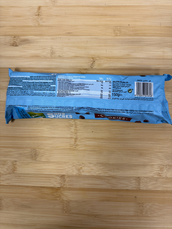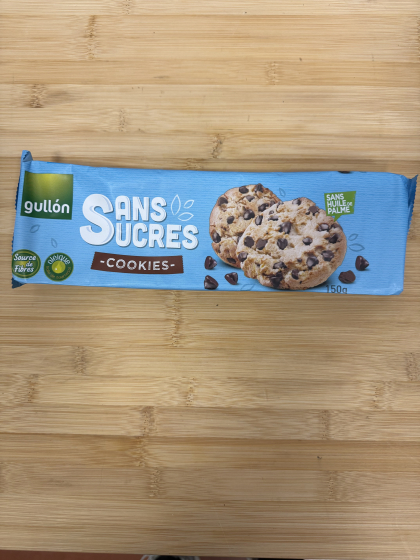 Goûtez les Cookies Sans Sucres, des biscuits sans sucre, avec des pépites de chocolat, et source de fibres. Ingrédients Ingrédients: Farine de blé, gouttes de chocolat sans sucres (pâte de cacao, édulcorant (maltitol), beurre de cacao, émulsifiant (lécithine de soja), arômes), graisse végétale (huile de tournesol riche en acide oléique), édulcorant (maltitol e isomalt), agents levants (carbonate acide de sodium et carbonate acide d’ammonium), sel, arômes. Peut contenir des traces de noix et de lait. Informations nutritionnelles pour 100g Valeur énergétique 1911 kJ / 458 kcal/ Graisse 24g dont Saturées: 6,0 g Mono-insaturées: 16 g Polyinsaturées: 2,0 g Glucides 63 g dont Sucres 0,5 g Fibre 4,0 g Sel 0,58 g0,58 g Protéines 5,9 g