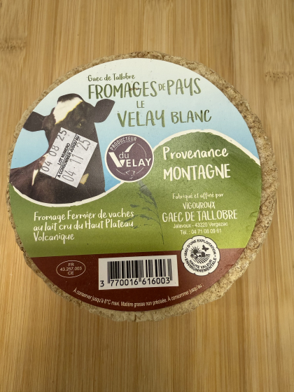 Prix au kilo : 11,50€ / kgLe fromage Le Velay est produit à la ferme par le GAEC de Tallobre à Jalavoux (commune : Vergezac), une exploitation familiale depuis 4 générations. Fabriqué à partir de lait de vache entier, issu des vaches nourries avec les récoltes de la ferme, ce fromage artisanal offre une saveur typée et authentique. Idéal à déguster seul, en plateau de fromages ou pour agrémenter des recettes sucrées-salées, Le Velay reflète tout le savoir-faire et la passion des producteurs locaux.