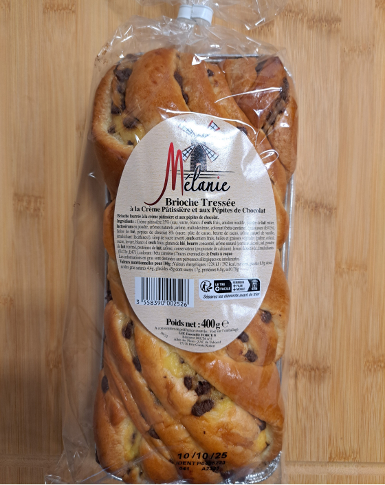 Soit 10€38 le kg Ingrédients : Crème pâtissière 35%( eau, sucre, blancs d’œufs frais, amidon modifiée, poudre de LAIT entier, lactosérum en poudre, arômes naturels, arôme, maltodextrine, colorant (béta carotène), épaississant (E415)), Farine de BLE, pépites de chocolat 8%( sucre, pâte de cacao, beurre de cacao, arôme naturel de vanille, émulsifiant (lécithines)), sirop de sucre inverti, OEUFS entiers frais, huiles et graisses végétales (palme, colza), sucre, levure, blancs d’OEUFS frais, gluten de BLE, BEURRE concentré, arôme naturel (contient alcool), sel, poudre de LAIT écrémé, protéines de LAIT, arôme, conservateur (propionate de calcium), levure désactivée, émulsifiants (E472e, E471), colorant (béta carotène). Traces éventuelles de FRUITS A COQUE. Valeurs nutritionnelles moyennes pour 100gr : Energie :292Kcal-1228 Kj, matières grasses 8.9 g dont acides gras saturés 4.4g, glucides 45g dont sucres 17g, protéines 6.8g, sel 0.78 g Gie ENSEMBLE FORCE 8 77170 Brie Comte Robert
