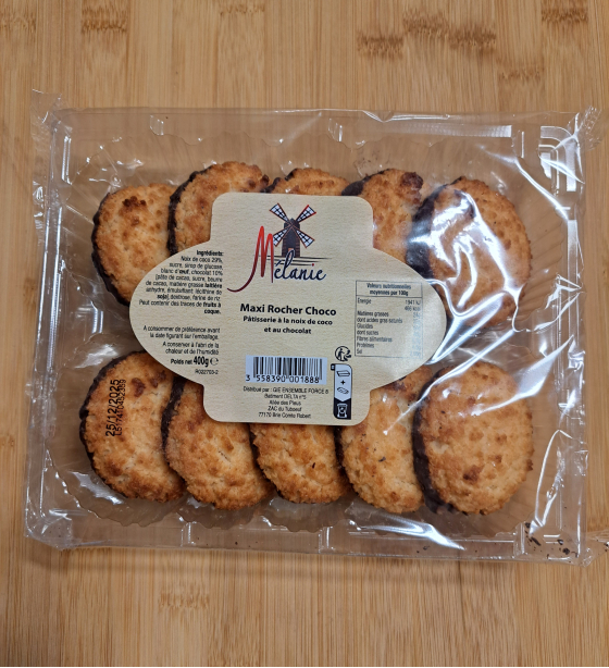Soit 12€45le kg Ingrédients : Noix de coco29%, sucre, sirop de glucose, blanc d'OEUF, chocolat 10% [ pâte de cacao, sucre, beurre de cacao, matière grasse LAITIERE andhydre, émulsifiant: lécithine de SOJA], dextrose, farine de riz. Peut contenir des FRUITS A COQUE Valeurs nutritionnelles moyennes pour 100gr Energie : 466Kcal-1941Kj, matières grasses 24g dont acides gras saturés 22g, glucides 54g dont sucre 46g, fibres alimentaires 6.3g protéines 4.6g, sel 0.06g GIE ENSEMBLE FORCE 8 77170 Brie Comte Robert