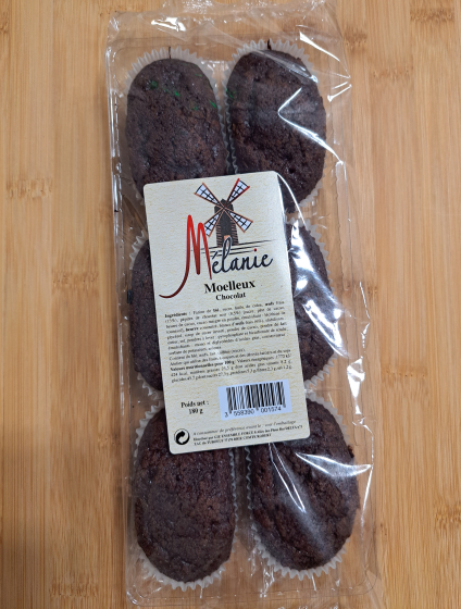 Soit 13€11 le kg Ingrédients : Farine de BLE, sucre, huile colza, OEUFS frais 13%, pépites de chocolat noir (8.5%)[sucre, pâte de cacao, beurre de cacao, cacao maigre en poudre, émulsifiant : lécithine de tournesol], beurre concentré, blanc d’OEUFS frais (6%), stabilisant : glycérol, sirop de sucre inverti, poudre de cacao, poudre de LAIT entier, sel, poudre à lever : pyrophosphate et bicarbonate de soude, émulsifiants : mono et diglycérides d’acides gras, conservateur : sorbate de potassium, arômes. Traces de BLE, OEUFS, LAIT, SULFITES. Atelier qui utilise des fruits à coques et des dérivés laitiers et du soja. Valeurs nutritionnelles moyennes pour 100gr : Energie :424Kcal-1772Kj, matières grasses 25.5 g dont acides gras saturés 8 .2g, glucides 45.7g dont sucre 27.3g, protéines 5.3g, sel 1.2g Distribué par ENSEMBLE FORCE 8 77170 Brie Comte Robert