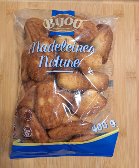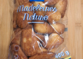 Soit 8€ le kg Ingrédients : Farine de BLE 33%, huile de colza sucre, ŒUFS 18%, sirop de glucose-fructose, stabilisant: glycérol, poudre à lever: carbonates d'ammonium-carbonates de sodium-citrates de sodium (BLE), sel, gluten de BLE, LAIT écrémé en poudre, fibre végétales, arôme naturel. Peut contenir des traces de SOJA et de FRUITS A COQUE. Valeurs nutritionnelles moyennes pour 100gr Energie : 451Kcal-1887Kj, matières grasses 23g dont acides gras saturés 2.7g, glucides 54g dont sucre 25g, fibres alimentaires 1.40g protéines 6.3g, sel 0.53 g Fabriquer par MADELEINES BIJOU 87500 SAINT YRIEIX FRANCE