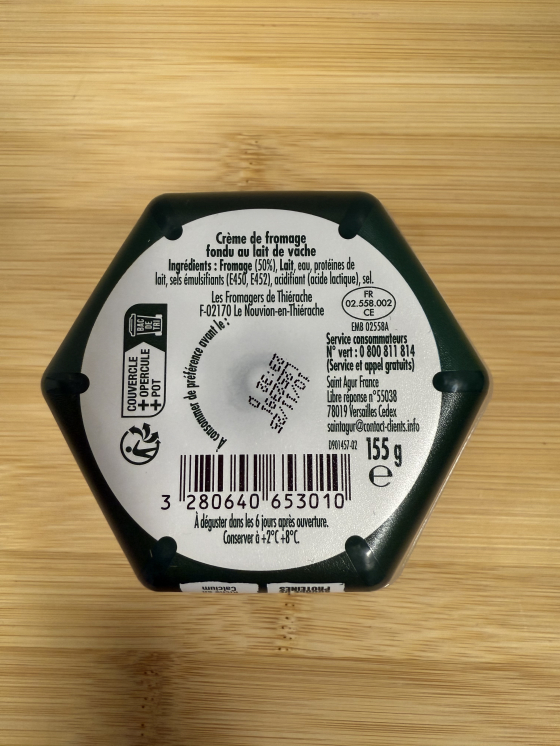 Ingrédients : Fromage (50 %), lait, eau, protéines de lait, sels émulsifiants (E450, E452), acidifiant (acide lactique), sel.