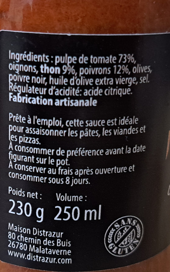 Sauce Tomates thon et poivrons 250ml
