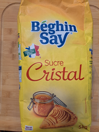 Soit 3€06 le kg Valeurs nutritionnelles moyennes pour 100gr Energie : 400Kcal-1700Kj, matières grasses 0g dont acides gras saturés 0g, glucides 100g dont sucre 100g, protéines 0g, sel 0 g BEGHIN-SAY 77230 MOUSSY LE VIEUX FRANCE