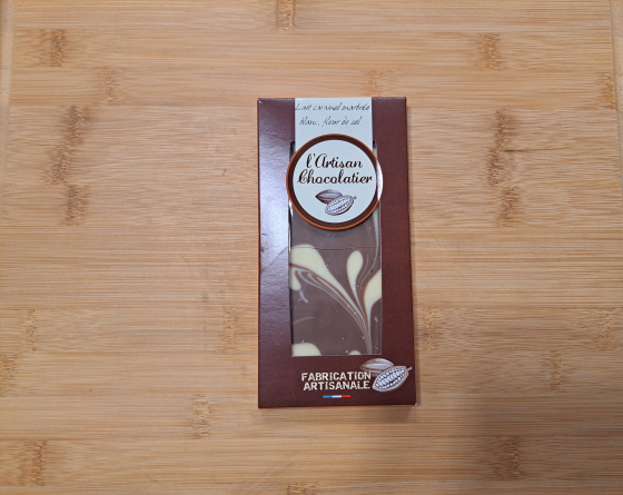 Soit 59.80€ le kg Ingrédients :sucre, beurre de cacao, poudre de lait entier, Pâte de cacao ,poudre de caramel ( poudre de lait, poudre de lait écrémé, protéines de lait, sucre, beurre),poudre de lait écrémé, lactosérum en poudre , lactose, fleur de sel 2%, émulsifiant: lécithine de soja, arôme naturel de vanille. PEUT CONTENIR DES TRACES DE FRUITS A COQUE. Valeurs nutritionnelles moyennes pour 100gr Energie : 2275kj-547kcal, matières grasses 34g dont acides gras saturés 21g, glucides 53g dont sucre 53g, protéines 6.4g, sel 2.08 g Fabriquer par L'ARTISAN CHOCOLATIER 17000 LA ROCHELLE