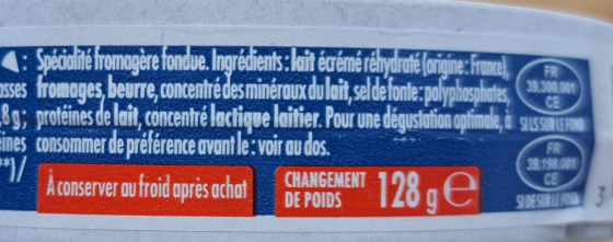 Lait écrémé réhydraté (origine France), fromages, beurre, protéines de lait, concentré de minéraux du lait, sels de fonte (E452), concentré lactique laitier